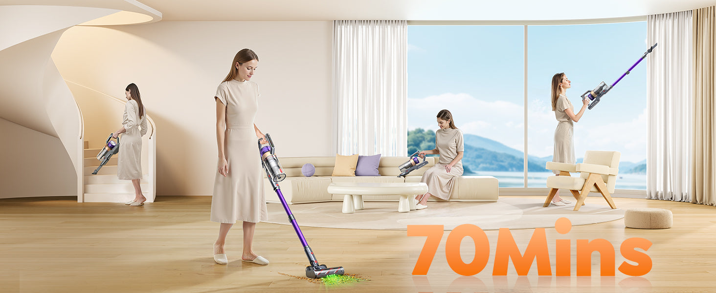 - 【70-Minute Runtime in ECO Mode】This cordless vacuum cleaner is equipped with 8 high-capacity batteries, offering an extended runtime of up to 70 minutes in energy-saving ECO mode (about 15 minutes in MAX mode), which is sufficient for cleaner enough for a 2,200 sq.ft home. The detachable battery design supports separate charging; with a spare battery, it can achieve double battery life.